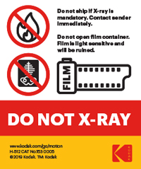 위의 설명과 함께, 코닥 홈페이지에서는 필름 통과 보관함에 부착 가능한 스티커 서식을 제공한다. 코닥에서 제공하는 DO NOT X-RAY 라벨. 6장짜리 레터 사이즈 스티커의 모습은 위 사진과 같다. . 레터 사이즈 용지에 6장 정도 들어가는 구조로 디자인되어 홈페이지에 올려 두었더라. 동시에 함께 인쇄하여 부착할 수 있는 라벨 서식 역시 함께 제공하고 있었다.