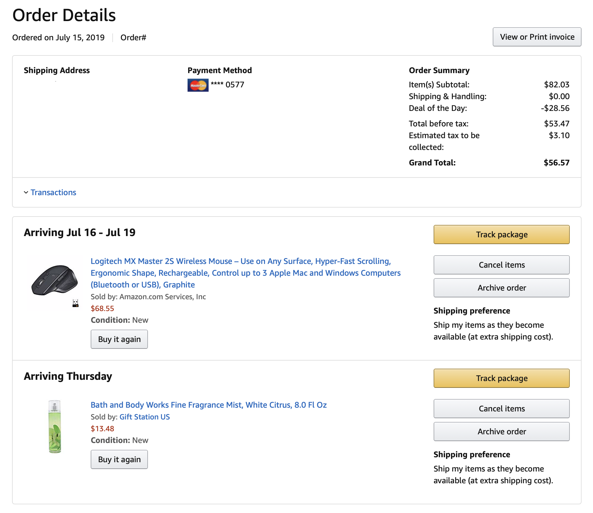 아마존 프라임데이 세일로 로지텍 MX 마우스가 40불에 팔리는 것을 목격. 곧 미국에서 귀국 예정인 친구한테 보냈다. 프라임이라 배송비는 따로 부담하지 않았고, 세일즈 택스만 부담하여 지불하였다.